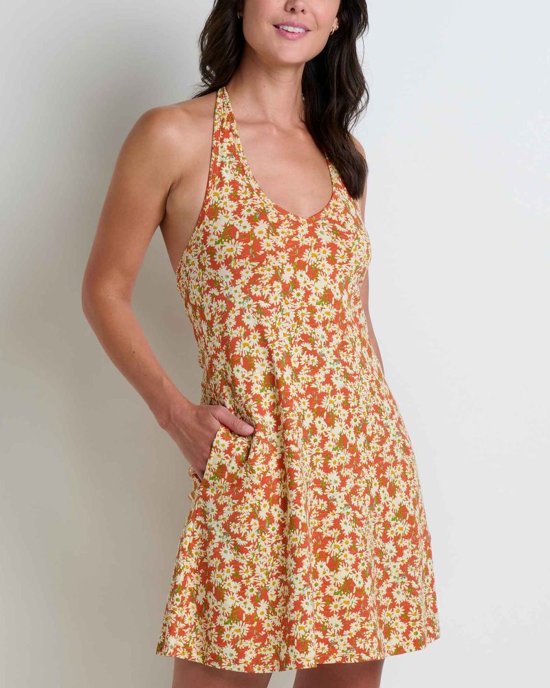 A halter dress fit for a spring queen. A long line shelf bra and hand pockets create one-and-done outfit ease; pretty prints will have you collecting compliments like flowers in a basket.
