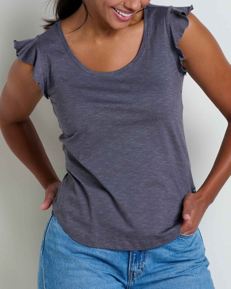 Flirty ruffle cap sleeves make this tee anything but basic. Made from our favorite Samba Dia fabric. this feminine t-shirt is a fresh twist on a classic scoop neck t-shirt.