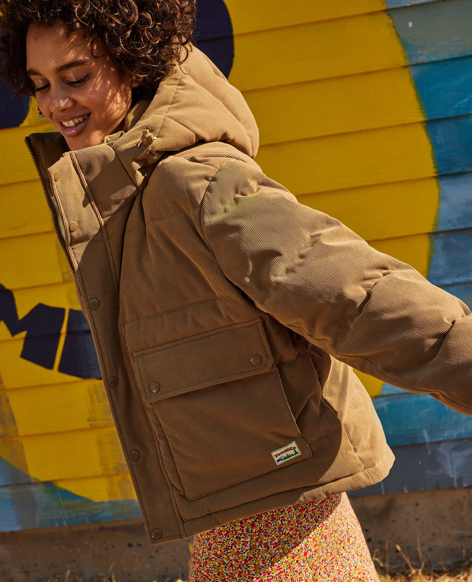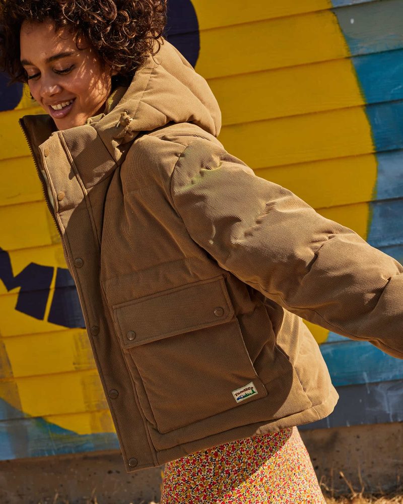 Cozy and cute. all in one water-resistant package. A drop tail and storm snap over the front zip keep out the drafts. and generous hand pockets hold the snacks. It’s also got a removable hood.