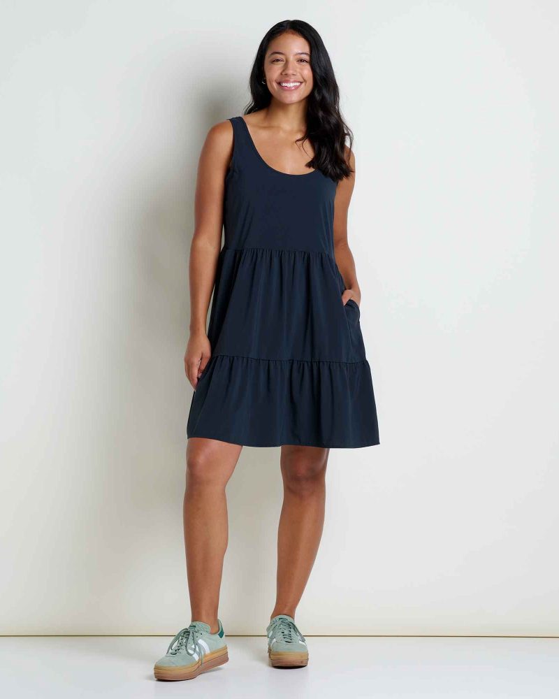 You’ll be hard-pressed to find a more go-with-the-flow dress. Crafted from lightweight recycled polyester and a pinch of elastane. a tiered silhouette dries quick and drapes great even after the longest of train rides or in the smallest of carry-ons.